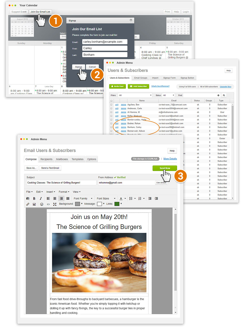 Build and manage your email list, affordably. Let visitors join your email list using our simple signup form. Send subscribers event reminders, invitations, and newsletters - even request an RSVP!